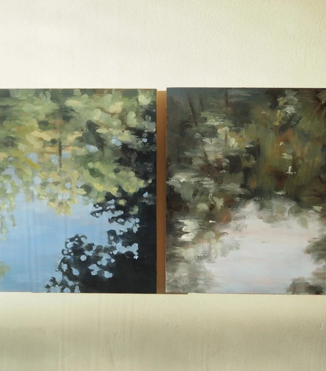 No meu olhar curioso, vejo o céu. Saboreio tons de azul ofuscados por uma luz intensa. Dali surgem galhos e folhas. A cada passo crescem ramos de todos os lados. Debruço-me sobre o que ali encontro. Estou face a face com uma silhueta. Parece-me familiar. Por breves momentos cruzamos olhares. Não lhe vejo a face mas olha-me de volta. Vê-me com o mesmo espanto. Move-se ao meu balouçar. É a minha silhueta. Sou eu. refletida naquele céu, naquelas nuvens, naqueles ramos.